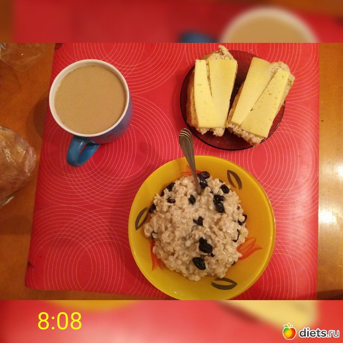 Овсянка на воде с изюмом, кофе со сливками, бутеры (отрубной хлеб+сыр)