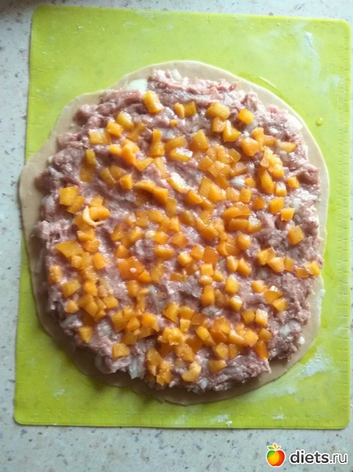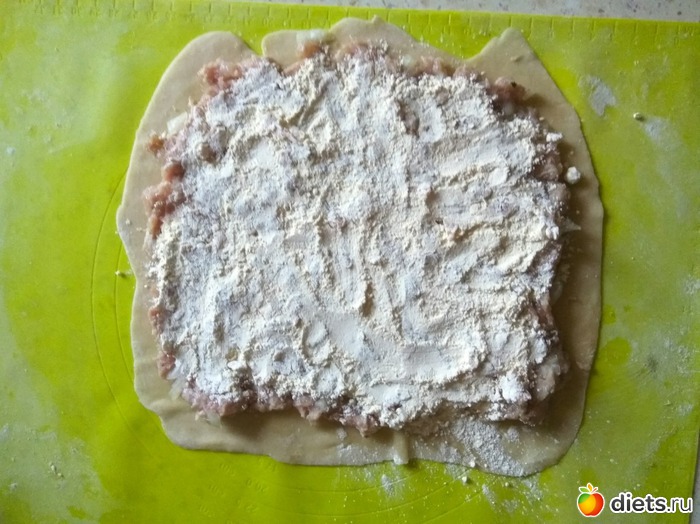 Мясо пропустить через мясорубку, посолить, поперчить, хорошо размешать, можно отбить. Разложить фарш ровным слоем на пласты теста, отступая от края около 2 см.