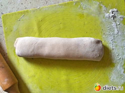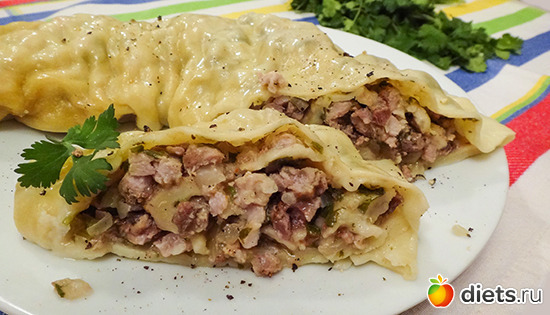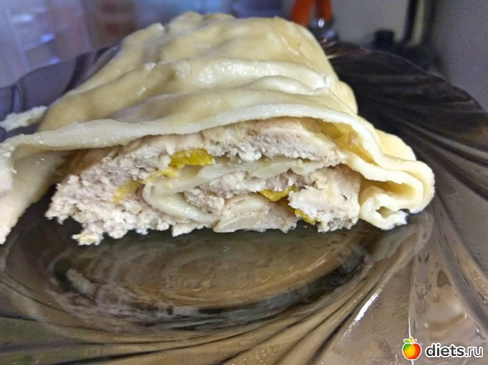 А если порезать длинными кусочками и сложить их внахлест, то это уже будет по немецки, тогда начинку готовим обычно без мяса, можно просто смазать сливочным маслом и посыпать луком, тут видимо, намёк, на штрудель, но в нашей семье готовят так уже лет 40-50 и с чего началось уже не знаю, надо у бабушки спросить