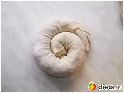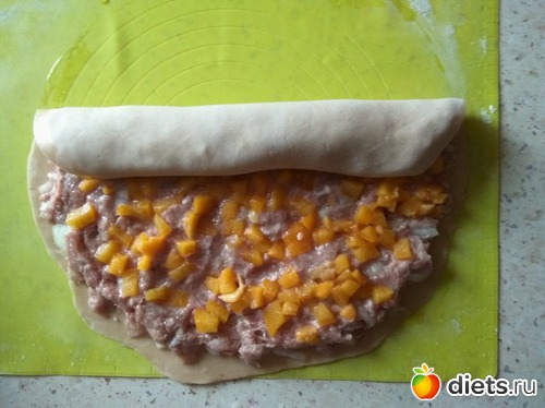 Мой улиткой никак не хотел сворачиваться - я туда фарша раза в 4 больше положила, чем в рецепте требуется.