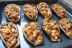 Положите баклажаны в лоток для выпечки, заполните баклажаны фаршем и посыпьте тертым сыром.