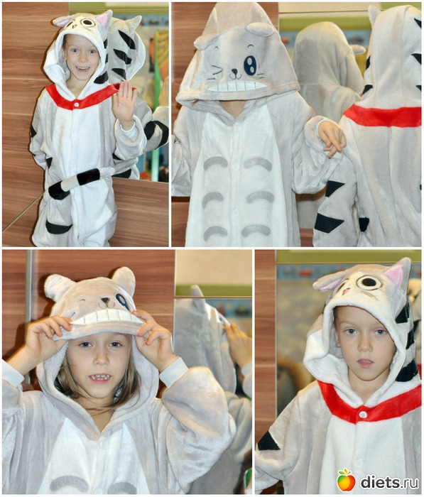 Самый качественный и приятный - детский костюм Пикачу. Очень мягкий, приятный на ощупь пушистый материал. Сзади молния для удобного отправления естественных потребностей. Второй костюмчик - малиново-красный, то ли лисенок, то ли енотик в таком цвете, из такой же ткани. Хотя заказывала одинаковые размеры, красный - намного больше и длиннее. Года через 2, может, будет как раз