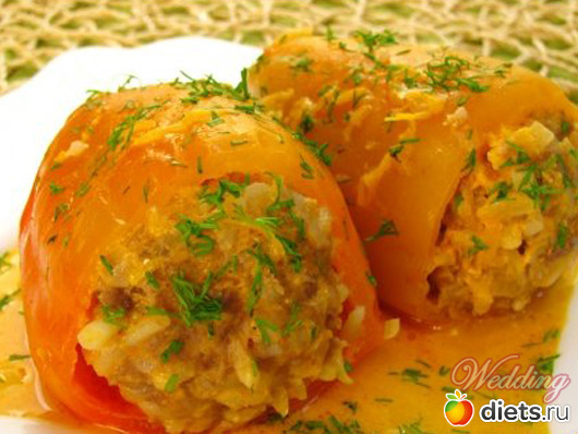 Лук мелко покрошить. Морковь натереть на мелкой терке. Половину лука обжарить на растительном масле. Добавить половину моркови, обжарить. Смешать фарш и рис. Добавить обжаренные морковь и лук, посолить, поперчить, хорошо перемешать. У перца отрезать верхушку, удалить семена. Перец наполнить фаршем. Смешать сметану и томатную пасту. В кастрюльке смешать оставшиеся лук, морковь. Добавить сметанно-томатный соус, перемешать. Выложить перцы. Налить воду так, чтобы она доходила до середины перцев. Тушить на среднем огне, под крышкой, около 40 минут. Подавать со сметаной или с соусом, в котором тушились перцы.