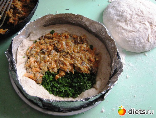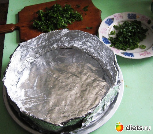 Теперь достала тесто и отделила немного и сделала вокруг фольги, а в средину положила зеленый лук, свежую петрушку и начинку.