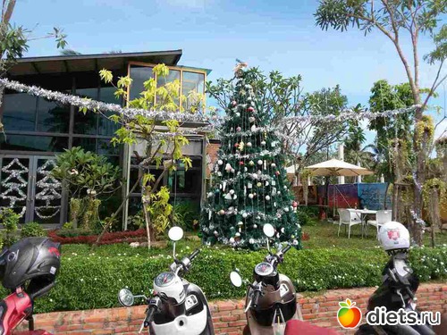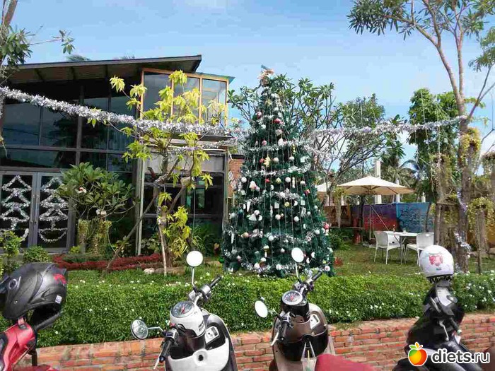 а вот такая ёлочка стоит у входа в кафе..прикольно видеть наряженную ёлку среди зелени и лета..