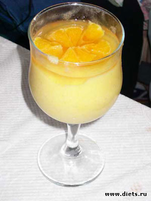 5. Разложить по 4 бокалам. Сверху положить нарезанный апельсин и равномерно залить каждый бокал отложенным сначала соком.