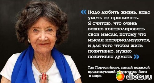 Тао Порчон-Линч – уникальная женщина. Представители Книги рекордов Гиннесса признали ее самой старой преподавательницей йоги в мире. Ей 94 года, но выглядит она гораздо моложе своих лет, потому что держит свой ум и тело в гармонии. В свои годы она преподает йогу и успешно выступает на конкурсах любительских бальных танцев, да еще и с 20-летними партнерами...