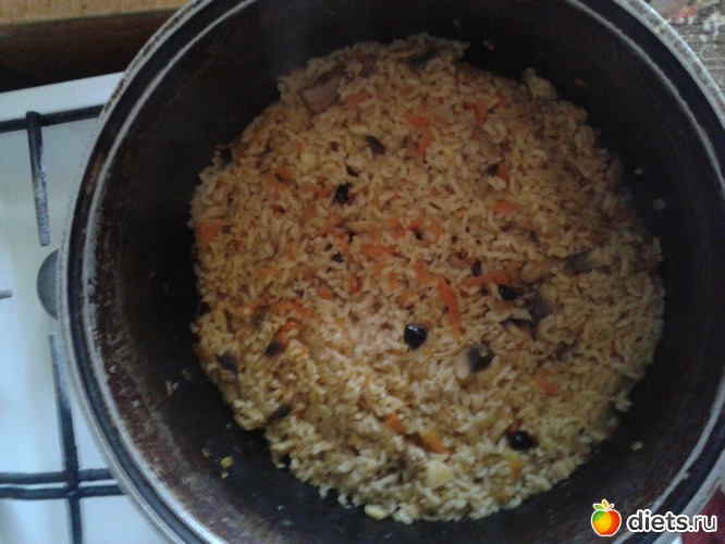 На 220 гр риса 2 морковки 370гр,3 гол.лук 170гр, грибы суш. 40 грамм посолила,перемешала и в мультиварку на программу Плов.