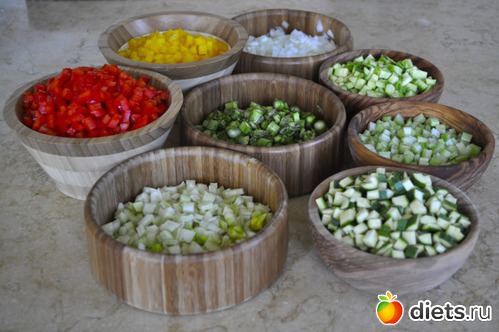 Вторая смесь - режем все оставшиеся овощи (можете спаржу поменять на морковь). Отставляем в сторону. Отдельно порежьте бекон.