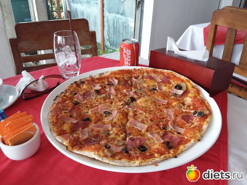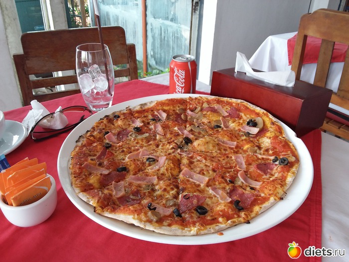 И вот такая огромная пицца...муж не смог ее доесть, взяли домой...