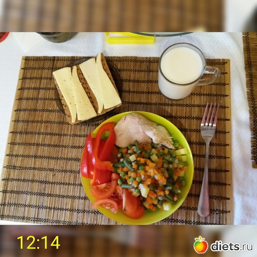 О: индогрудка, овощи варёные, помидор, болгарыч, чай с молоком, хлебцы с сыром