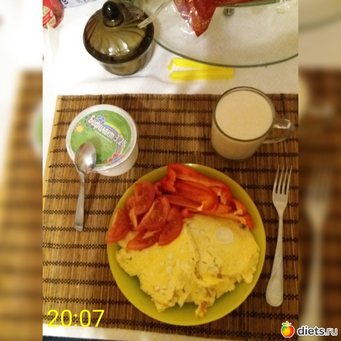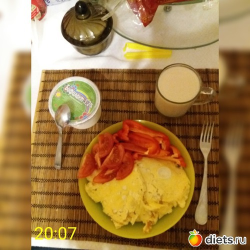 У: омлет (яйца, зерн.творог, масло), помидор, болгарыч, бифилакт, чай с молоком