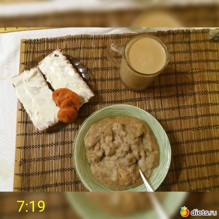 З: толокно на воде с маслом и бананом, хлебцы с президентом лёгким, курага, цикорий со сливками