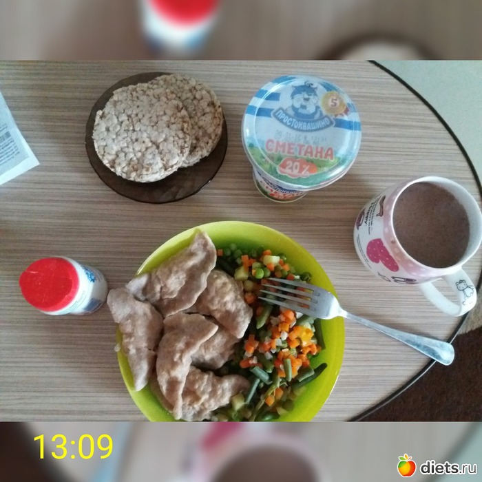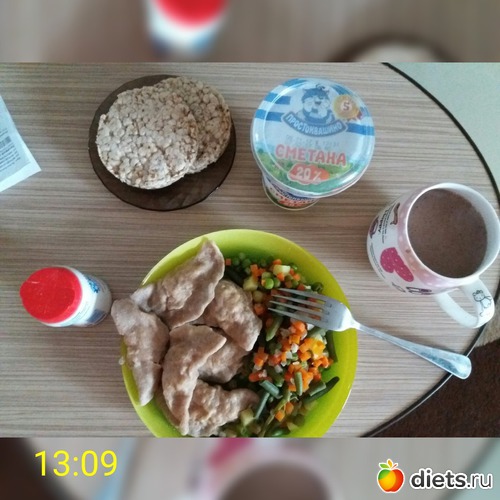 О: пп-пельмени (это ещё с того раза в морозилке болтались), сметана, варёные овощи, хлебцы, какао б/с