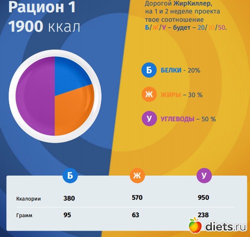 Так же нам дали меню и посчитали суточную норму калорийности, с расчетом Б/Ж/У – 20/30/50.