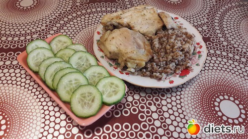 Обед - курица, запеченная в духовке + гречка отварная + 1/2 свежего огурца