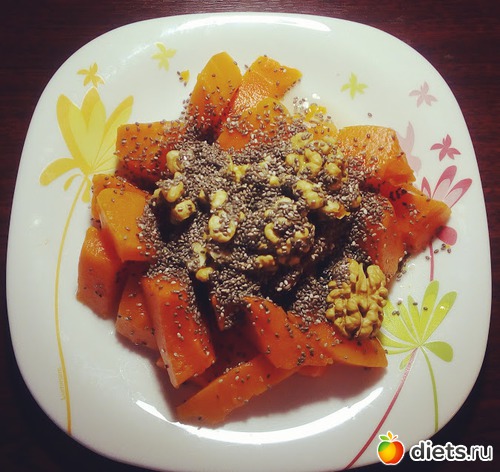На обед сварила тыкву, полила медом, добавила орехи и чию.