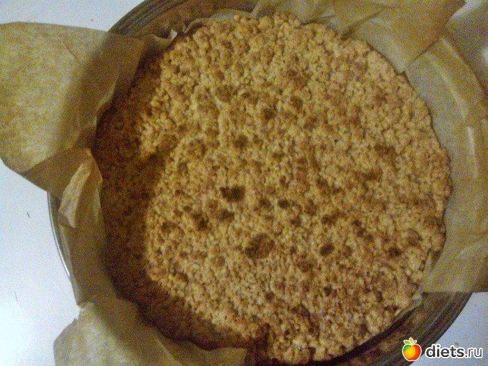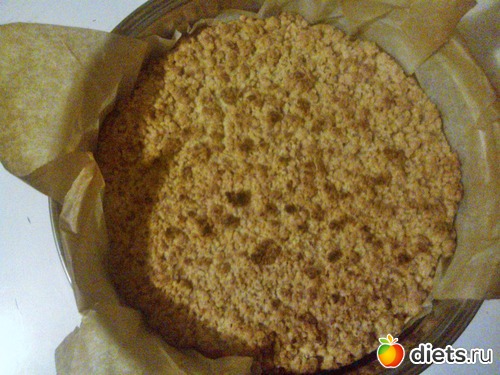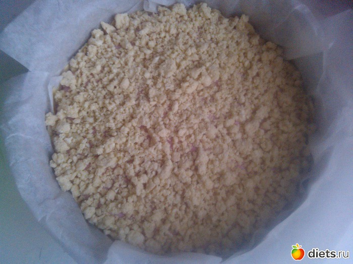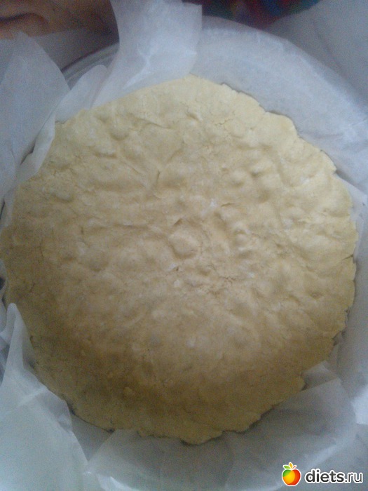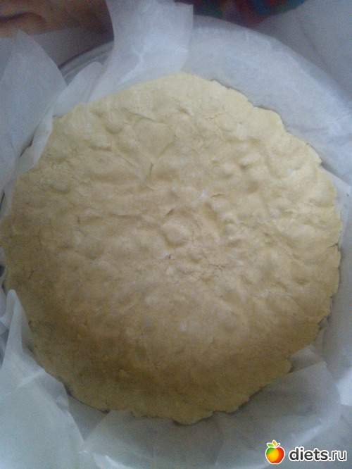Большую часть высыпаем в форму(у меня диаметр24см) и распределяем пальчиками, не забывая делать бордюрчик(3см)