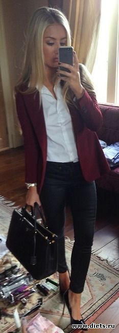 Деловые костюмы:брюки прямого кроя,юбки-карандаши,дорогой качественный материал,пиджак короткий и укорочённый. Опять же аса без рюшек и прочее ... рубашки,классические блузки. Есть комбинезоны-брюки-бананы,но обличающий верх.