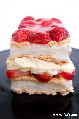 4. Обрезаем края безе, чтобы они были ровные, разрезаем безе пополам на 4 равных кусочка. На две половинки безе выкладываем порезанные ягоды клубники, поливаем соусом, украшаем маскарпоне и накрываем оставшимися половинками безе. Украшаем ломтиками клубники, поливаем соусом и сразу же подаем к столу.
