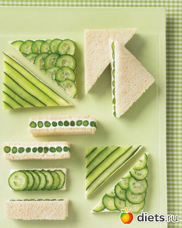 Бело-зеленый дуэт: вариации сэндвичей с мягким сыром, огурцами и горошком.