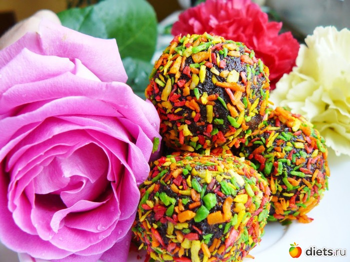 Рецепт этих конфет я подглядела на одном мастер-классе по приготовлению сладостей. Мне они показались очень изысканными и полезными. 5 ингредиентов плюс кокосовая стружка для украшения. Такие конфеты всегда украсят ваш стол. Или вы можете взять их в гости - угостить друзей :-)