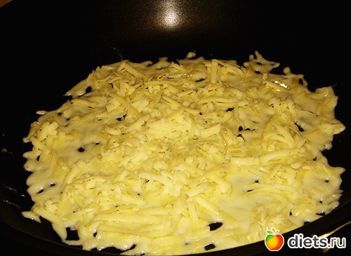 Дно плоской тарелки смазываем сливочным маслом, сверху натираем немного сыра, выкладываем из него круг диаметром 10-12 см. Ставим тарелку на 20 секунд в микроволновку или помещаем в разогретую духовку до расплавления сыра.