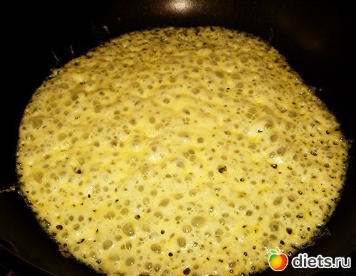 На хорошо разогретой сковороде, слегка смазанной растительным маслом, или на сухой сковороде с антипригарным покрытием 2 столовые ложки полученной смеси равномерно распределите по поверхности в виде блинчика.