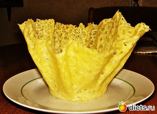 Достаем, даем немного остыть, затем аккуратно снимаем сырный круг с тарелки, кладем на перевернутый стакан и придаем нужную форму.
