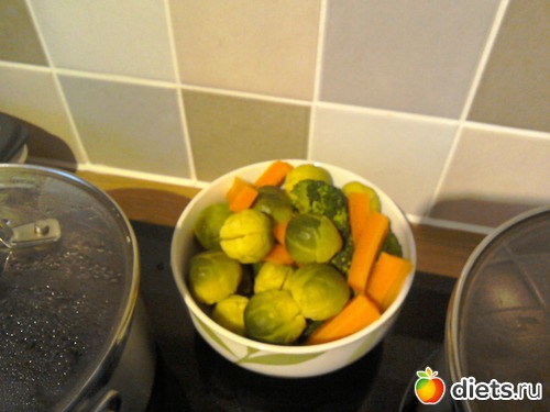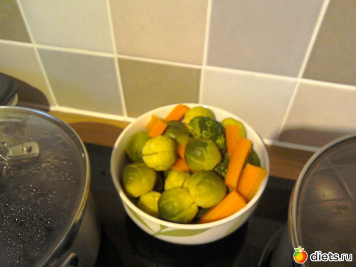 Второе фото, овощи: брюсельская капуста и брокколи отварные. Корень петрушки, морковь и типа тыквы, но это не тыква в духовке запеченые.