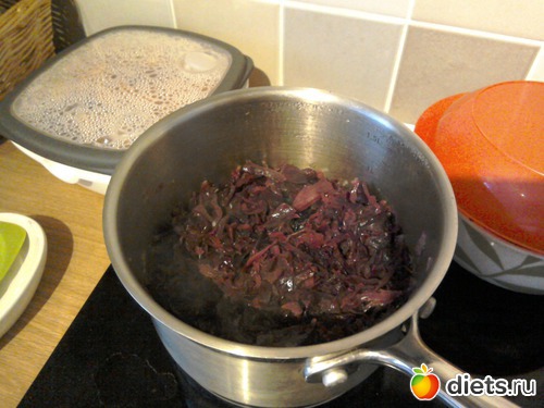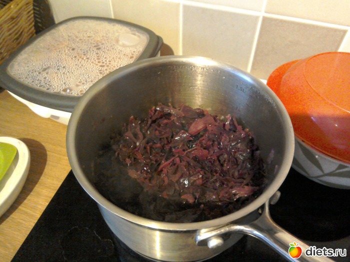Третье фото: капуста тушеные с коричневым сахаром, яблочный уксус, яблоко и приправа мускатный орех.