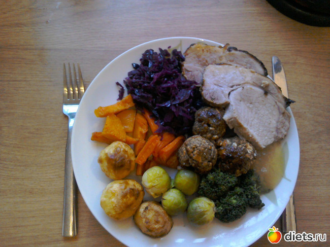 Со свининой обычно идет яблочный соус, очень вкусный, типа варенья из яблок для мясных блюд. С говядиной обычно грэвий, густой соус мясной, и для курицы тоже есть соус. Эти соусы можно и купить, а можно и самим сделать. И ещё некоторые делают типа пышек хлеб. Называются екшира пудинг, мой сын их обожает. Но я не делала. Сами понимаете почему.