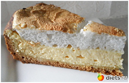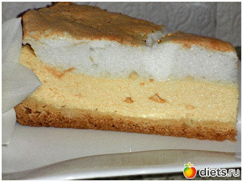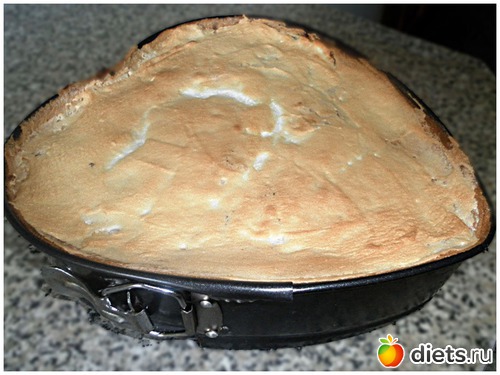 Выпекать при температуре 180С примерно 20 - 30 мин. Затем вынуть, наверх выложить суфле и печь еще 10-15 минут до золотистого цвета. Не передержите!