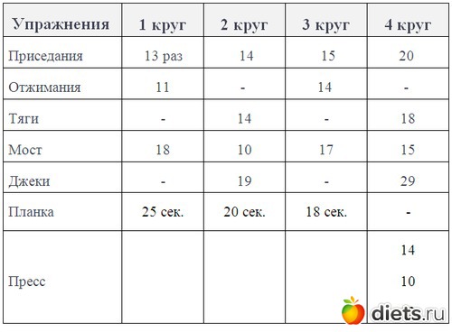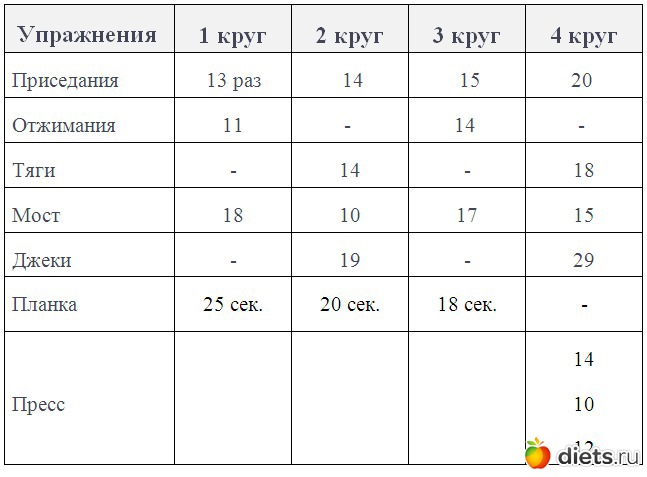 Приседания и мост делаем все 4 круга, 1 и 3 круг - отжимания, а на 2 и 4 круге вместо отжиманий делаем джеки.