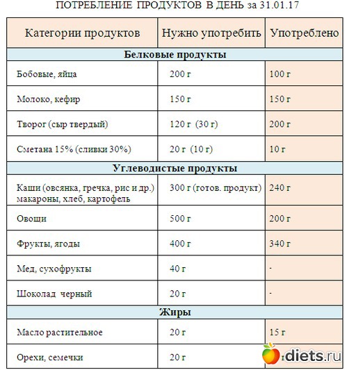 Мне очень помогает эта табличка, просто находка, благодаря ей, я могу видеть, сколько всего нужно съесть и сколько съедено за день. Если придерживаться этой таблицы, легко набрать нужный калораж с правильным бжу.