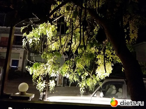 - общение сегодня было через интернет( вайбер, ватс ап, наш сайт), а вечером посидеоа в кафешке при магазине, пообщалась с разными соседями по поселку, сфоткала дерево, когда сидишь за столиком оно выглядит как буд то это виноград свисает - на фотке не очень похоже, но все равно красиво..