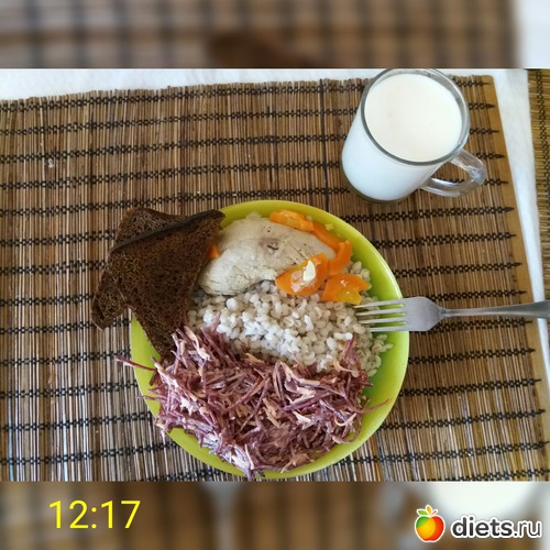 О: индогрудка туш.с овощами, перловка+1 ч.л. льняного масла, салат (свекла, сыр, чеснок, сметана), бородинский хлеб (подсушила на сковороде, вкуснотаааа