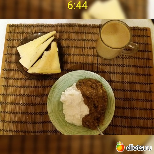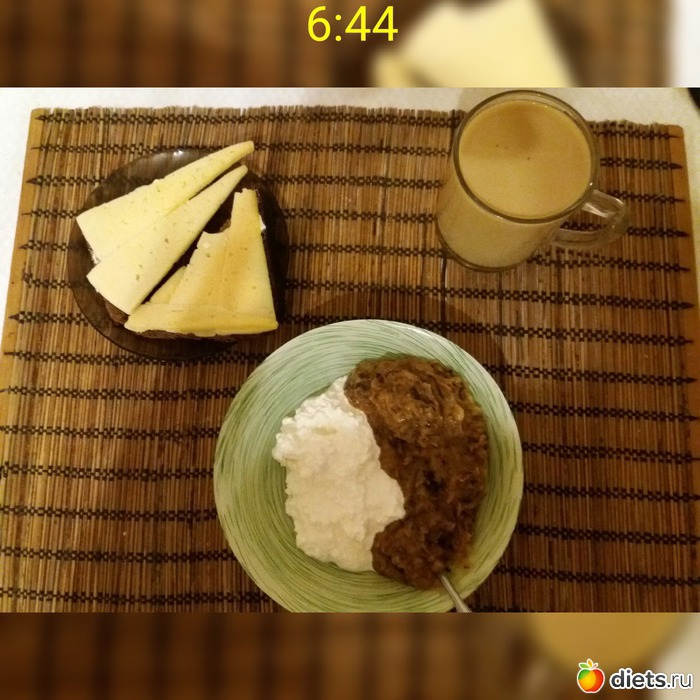 З: творог со сметаной и псевдо яблочно-черносливовым "вареньем", бородинский хлеб с маслом и сыром, цикорий с молоком