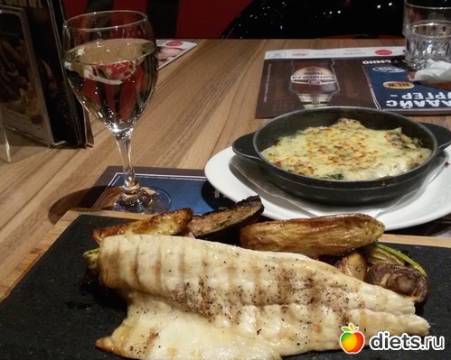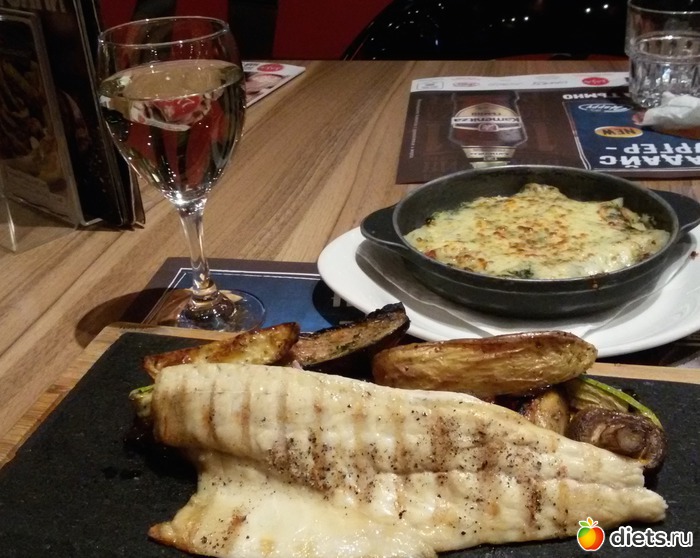 Как называется эта рыба по-русски - не знаю. белое вкусное филе. Дорогущее! Этот кусочек 8 евро ( для Болгарии бешеные деньги!) Приготовлено на гриле. И овощи на гриле