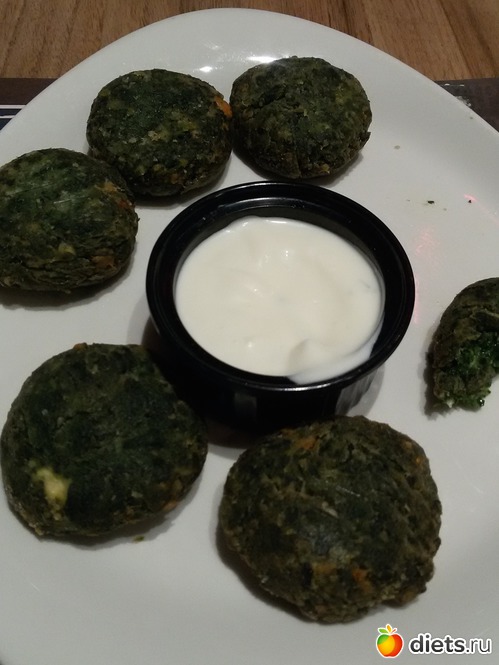 А это - котлетки из шпината и брынзы, на соус - кислое молоко ( аналог нашей простокваши)