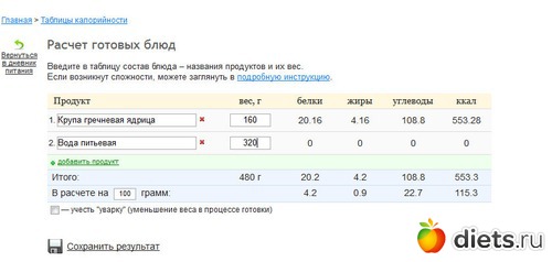 ну и плюс- дневник питания вам в помощь- там надо зайти в раздел Готовые блюда- расчитать на отдельной страничке- и внести крупу и воду (если каша на воде) -например -