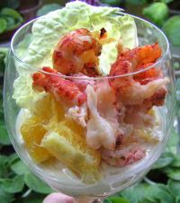 3 апельсина, 1 большой огурец, 1 стручок красного сладкого перца, 100 г риса, 100 г очищенных креветок, 1 лавровый лист, соль, молотый черный перец, 50 г майонеза, укроп.