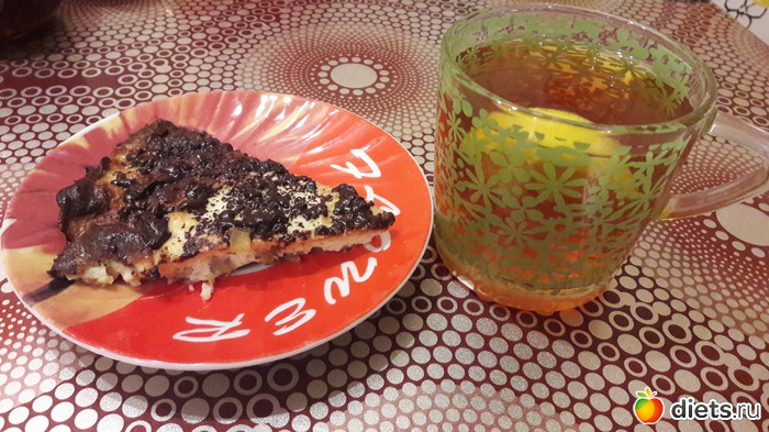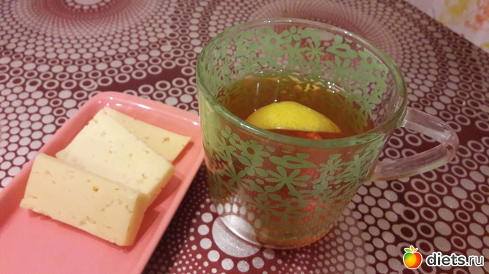 Завтрак - кусочек творожной запеканки с фруктами, 1 крекер и три кусочка сыра + чай