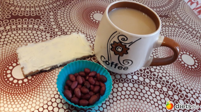 Перекус - хлебец с плавленным сыром, арахис и кофе с молоком