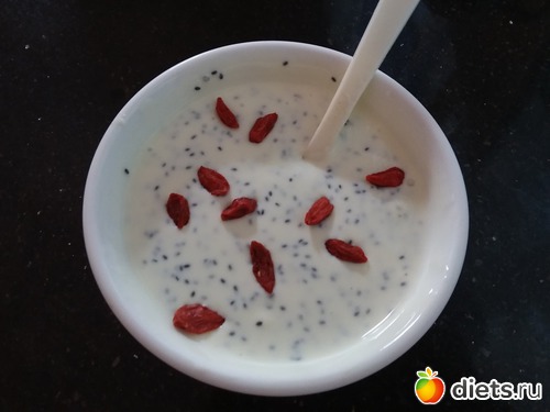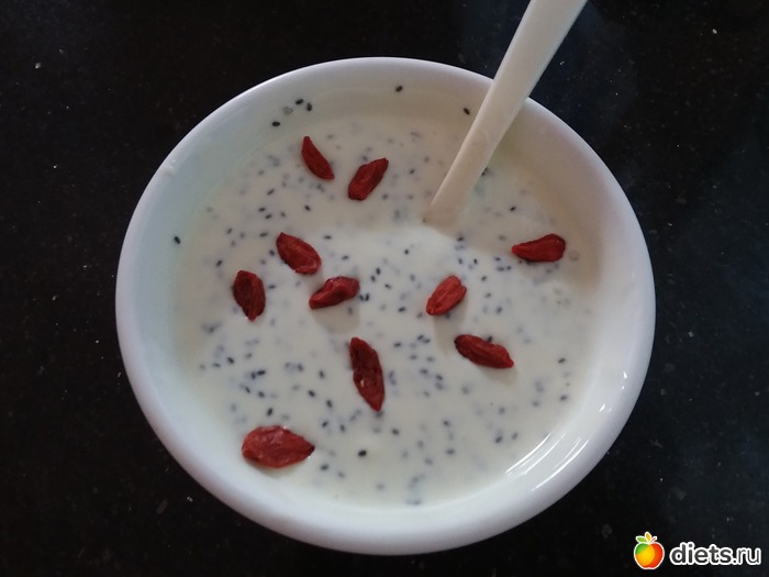 Мой завтрак: простокваша, 2 ч ложки семян чиа и 10 ягод годжи..