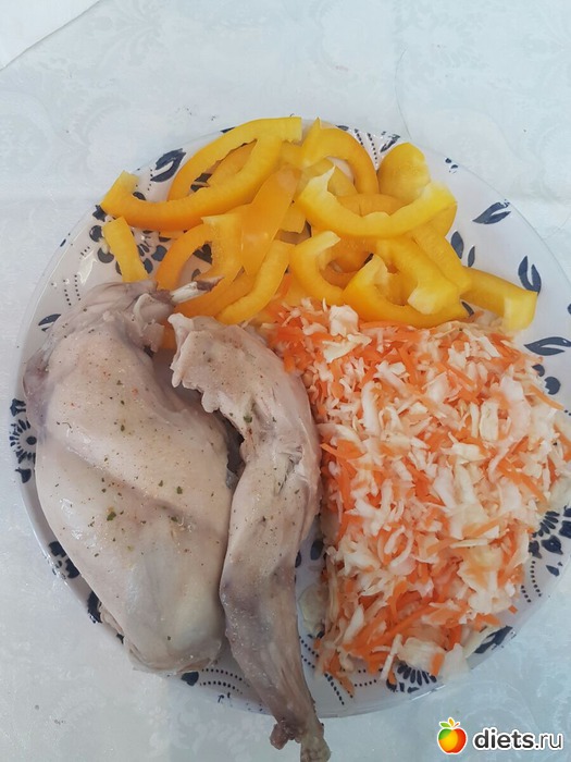 Мой долгожданный обед: кролик, салат из капусты и моркови, перец!