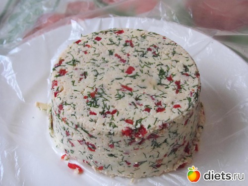 Как жидкость стечет так, что масса будет густая, сыр выложить плотно в любую форму, а сверху придавить грузом и оставить на 8-10 часов.