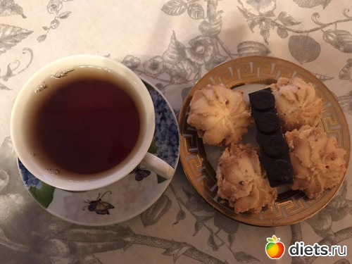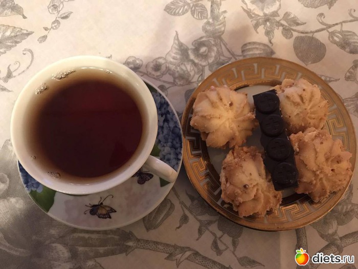 - Чай без сахара, полоска черного шоколада, 4 печенья