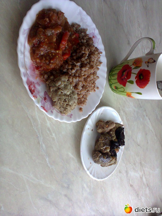 Обед: гречка, котлета паровая, свинина н/ж запеченная в фольге с черносливом, салат баклажановый и кофе.