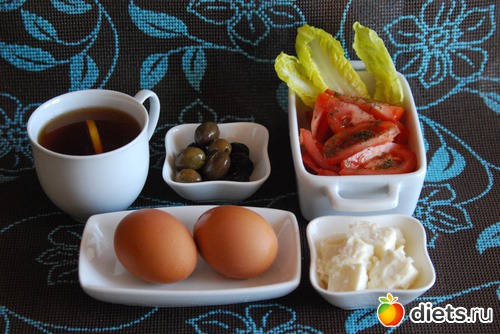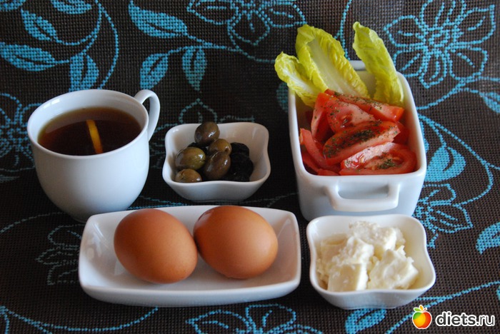 Вчера на завтрак: чай, сыр, салат из помидора, оливки, яйцо. На фото два но я съела одно.